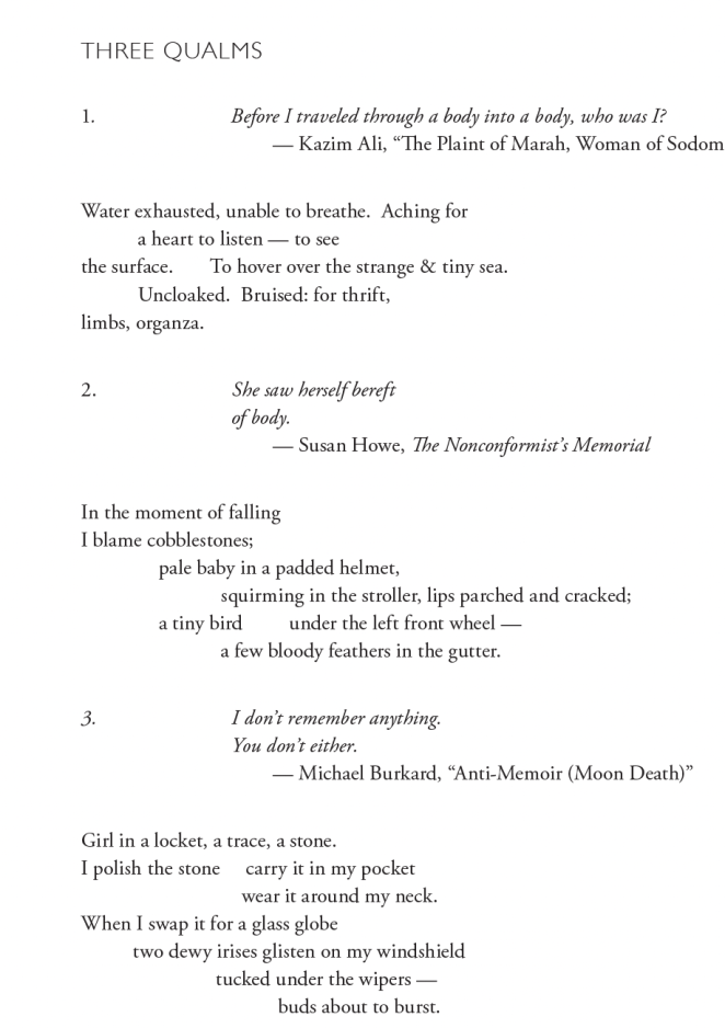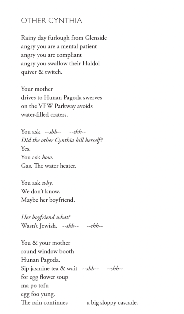 “Other Cynthia” was published in Driftwood Press and “Three Qualms” in Apeiron Review. A few more poems from Sleeping in the Dead Girl’s Room with gratitude for the editors who published them, some in earlier versions: